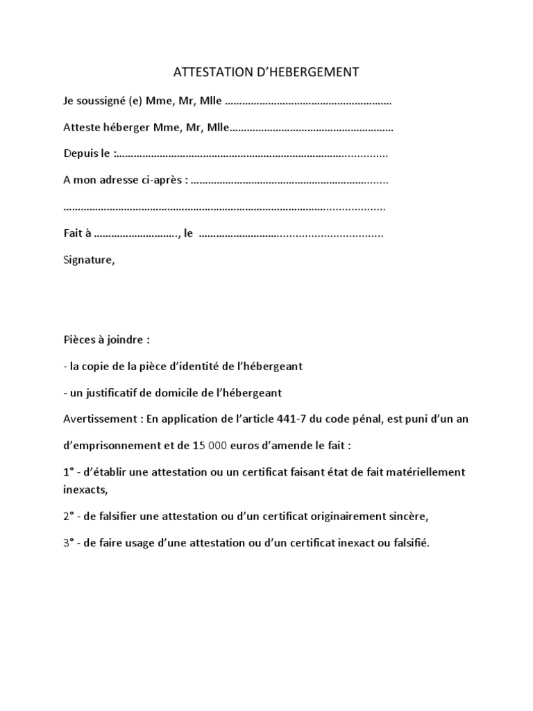 Apr 18, 2021 · attestation d'hébergement ce document est un modèle d'attestation d'hébergement , utilisable comme justificatif de domicile par toute personne hébergée par un tiers, pour les besoins de démarches administratives. Vous devez simplement remplacer les termes en. Exemple de modèle de lettre d'attestation sur l'honneur d'hébergement gratuit et vierge au format pdf ou word à remplir en ligne, à télécharger et à imprimer. Bien souvent, un modèle type de lettre est utilisé pour créer une attestation d'hébergement par exemple. Vous serez alerté(e) par courriel. L'attestation d'hébergement ne répond à aucun formalisme particulier : Voici un modèle gratuit d'attestation sur l'honneur type. L'attestation d'hébergement est une lettre par laquelle l'hébergeur atteste sur l'honneur qu'il héberge une personne à son domicile (souvent à titre gratuit). Vous êtes amené(e) à établir une déclaration sur l'honneur d'hébergement à titre gratuit pour la personne que vous accueillez ? Jun 27, 2021 · l'attestation d'hébergement, autrement appelée déclaration ou certificat d'hébergement, est un document justificatif qui peut être demandé à un particulier lors de diverses démarches administratives et commerciales (ouverture d'un compte bancaire, souscription d'un prêt, renouvellement de papiers d'identité auprès de la préfecture ou de la mairie, enregistrement d'un. Sep 29, 2019 · attestation d'hébergement : Nous vous proposons sur notre. Il s'agit d'un simple document établi sur papier libre, dans lequel l'hébergeant déclare héberger l'héberger.